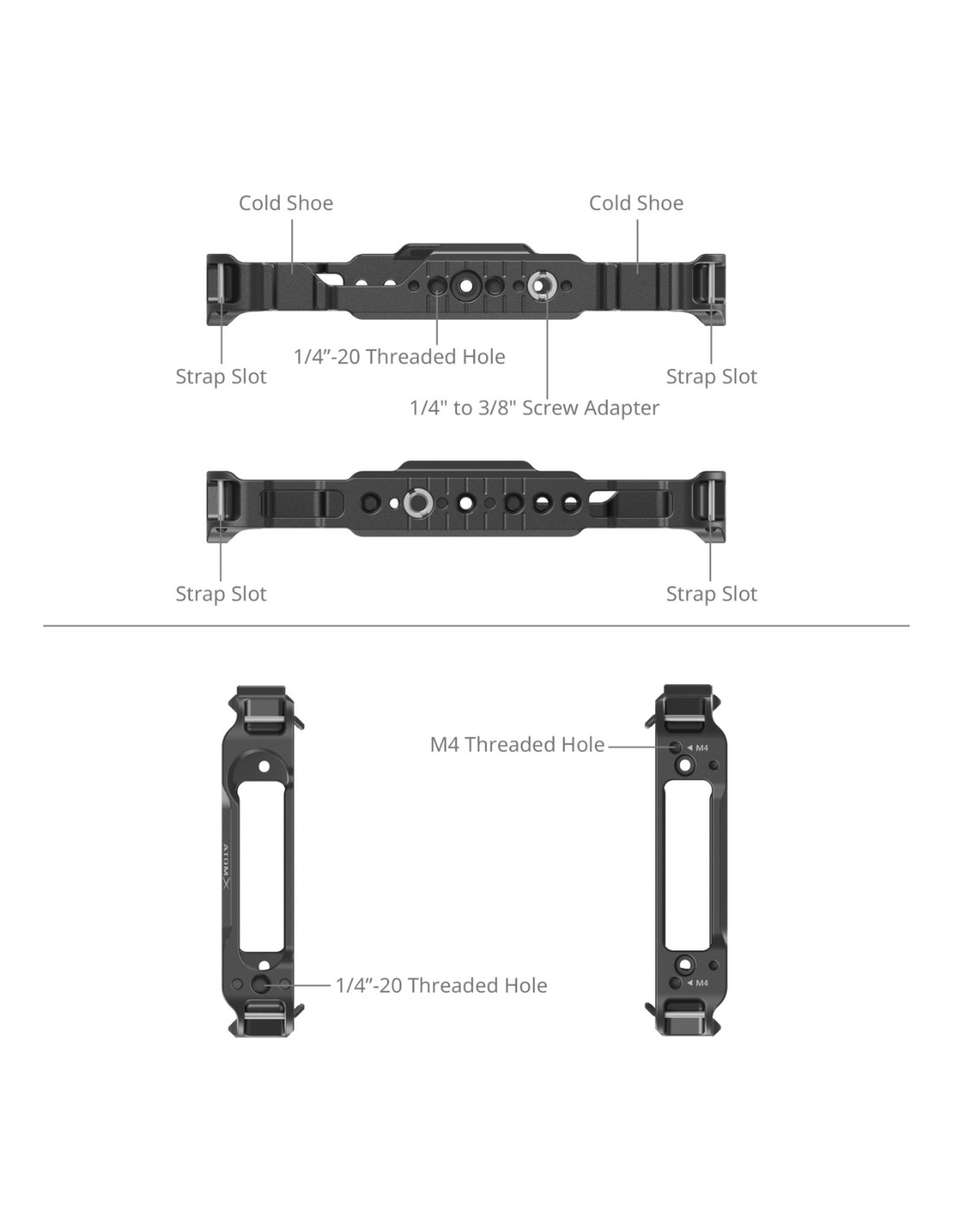 - Fixations multiples : Trous filetés 1/4"-20 et 3/8"-16 ; Points de montage ARRI anti-torsion ; Rails NATO sur le dessus et le dessous ; Griffe porte-accessoires intégrée