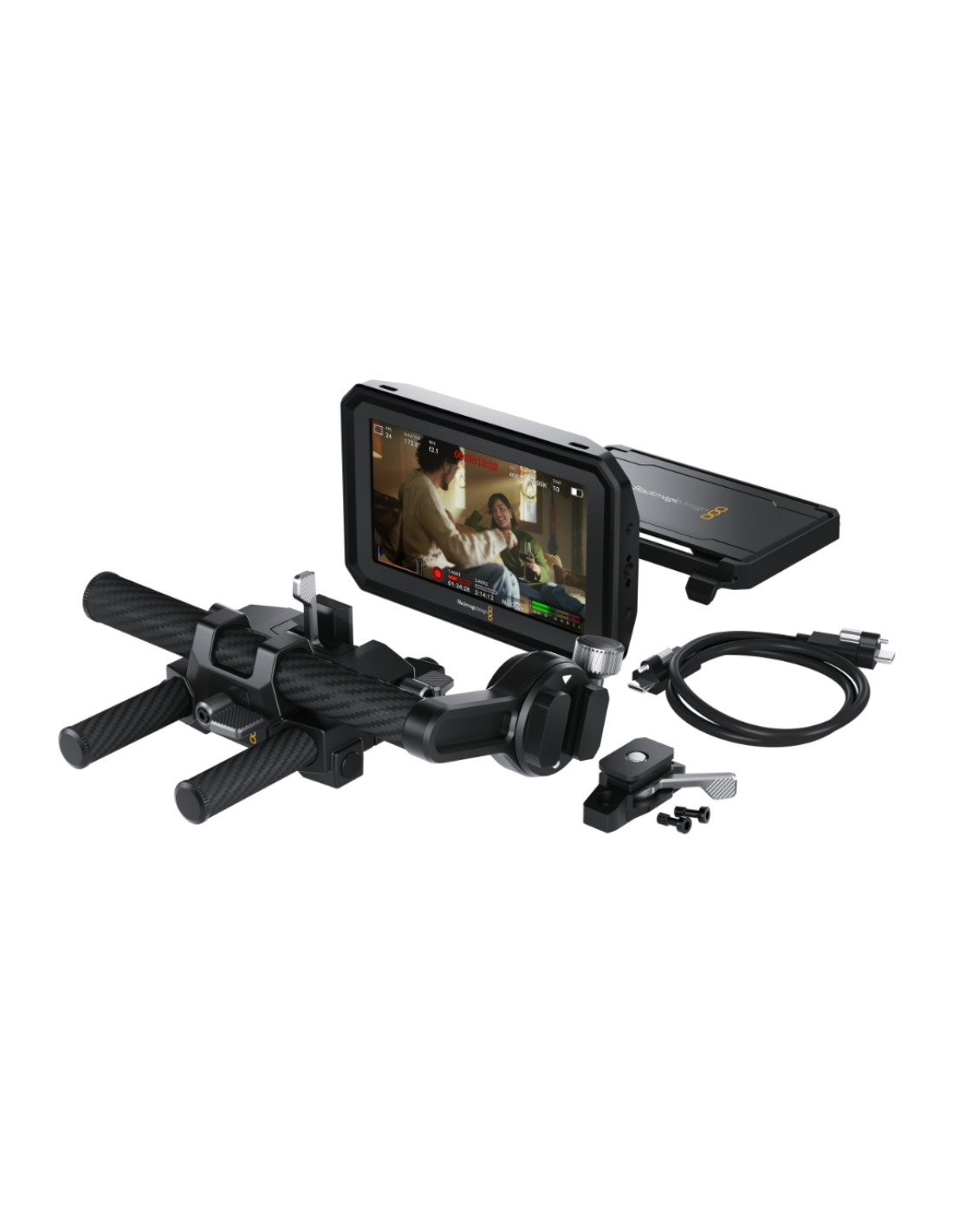 Le Blackmagic Pyxis Monitor EVF Kit est un kit complet qui transforme le moniteur PYXIS 5″ HDR en un viseur électronique (EVF) professionnel. Il comprend un paresoleil pliable, des fixations pivotantes et fixes, une monture en queue d’aronde et un support EVF sur tige en fibre de carbone. Ces accessoires permettent un montage sur caméra ou rig. Grâce au câble USB‑C verrouillable, il transmet vidéo, alimentation et contrôle caméra via un seul câble ; tout en offrant une luminosité de 1500 nits pour une visibilité optimale.
